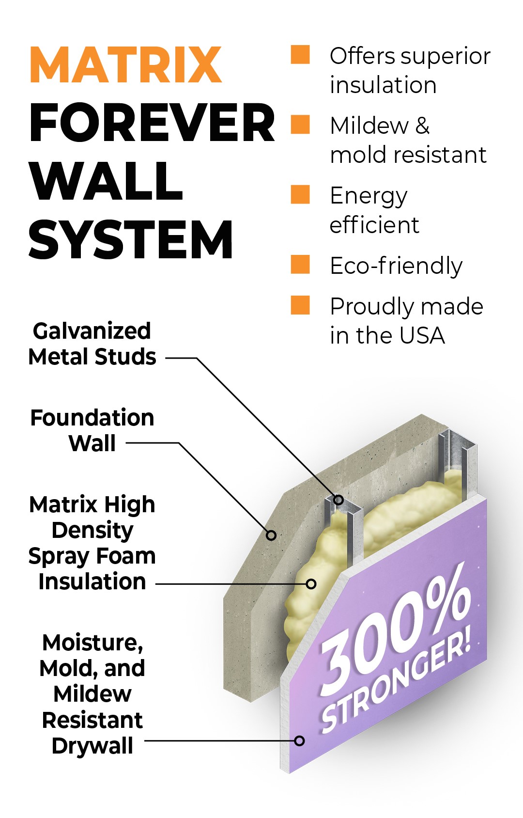 The Matrix Forever Wall is constructed using Metal Stud Framing, 2lb density spray foam and Purple Board with Dust Tech seam finishing compounds. Together these wall system components create the most energy efficient and water resistant basement wall system offered in the industry. The 2lb density spray foam creates a continuous vapor and thermal barrier that protects the interior finished space from harmful moisture levels that are present in all basements. Purple board and ProForm Dust Tech finishing compounds are the only Greenguard certified and low VOC wall finishing products on the market today.